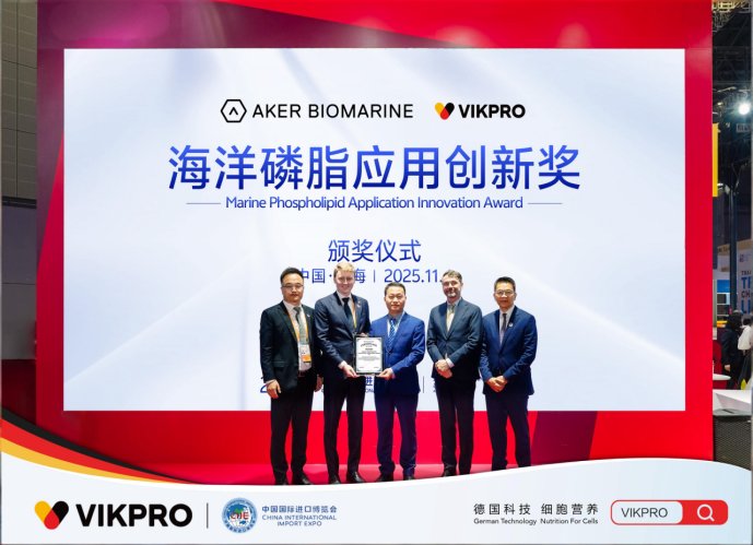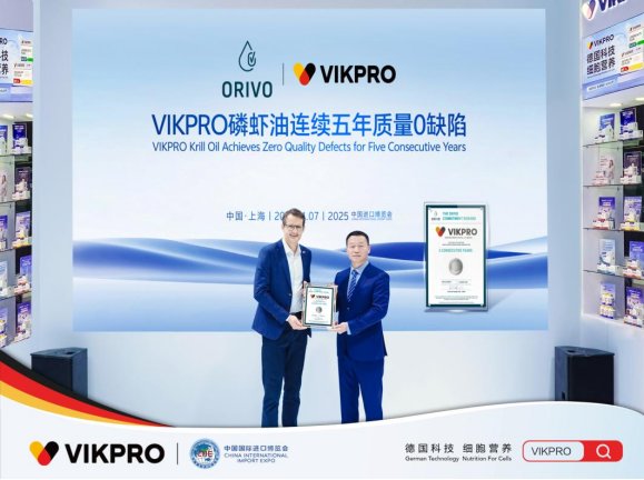 此外,国际检测机构ORIVO首席技术官Erik Fuglseth为VIKPRO颁发“连续5年质量0缺陷”认证奖。全球磷虾油供应商Aker亦为其颁发“海洋磷脂应用创新奖”,进一步巩固了VIKPRO在海洋营养品类的技术标杆地位。