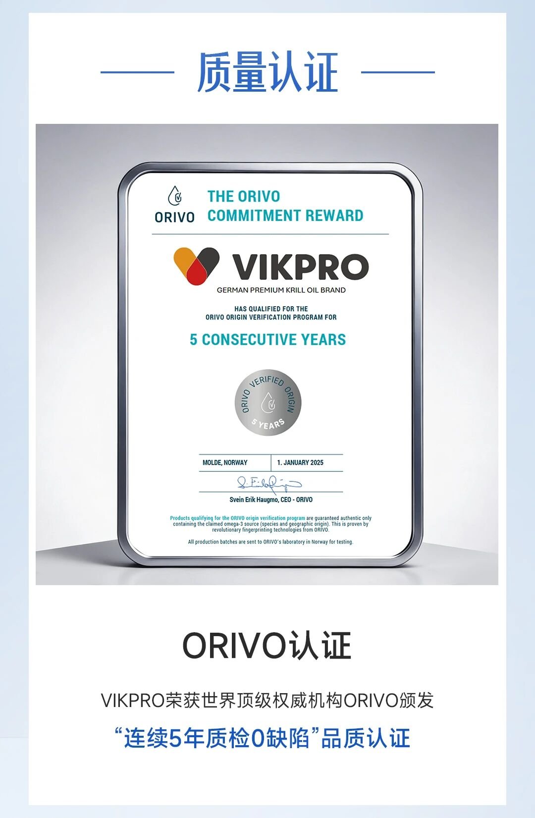 ORIVO已经连续5年对VIKPRO磷虾油及OMEGA-3产品进行独立检测,2025年1月,经过严苛检测,ORIVO为VIKPRO颁发“连续5年质量0缺陷”品质认证。![]()